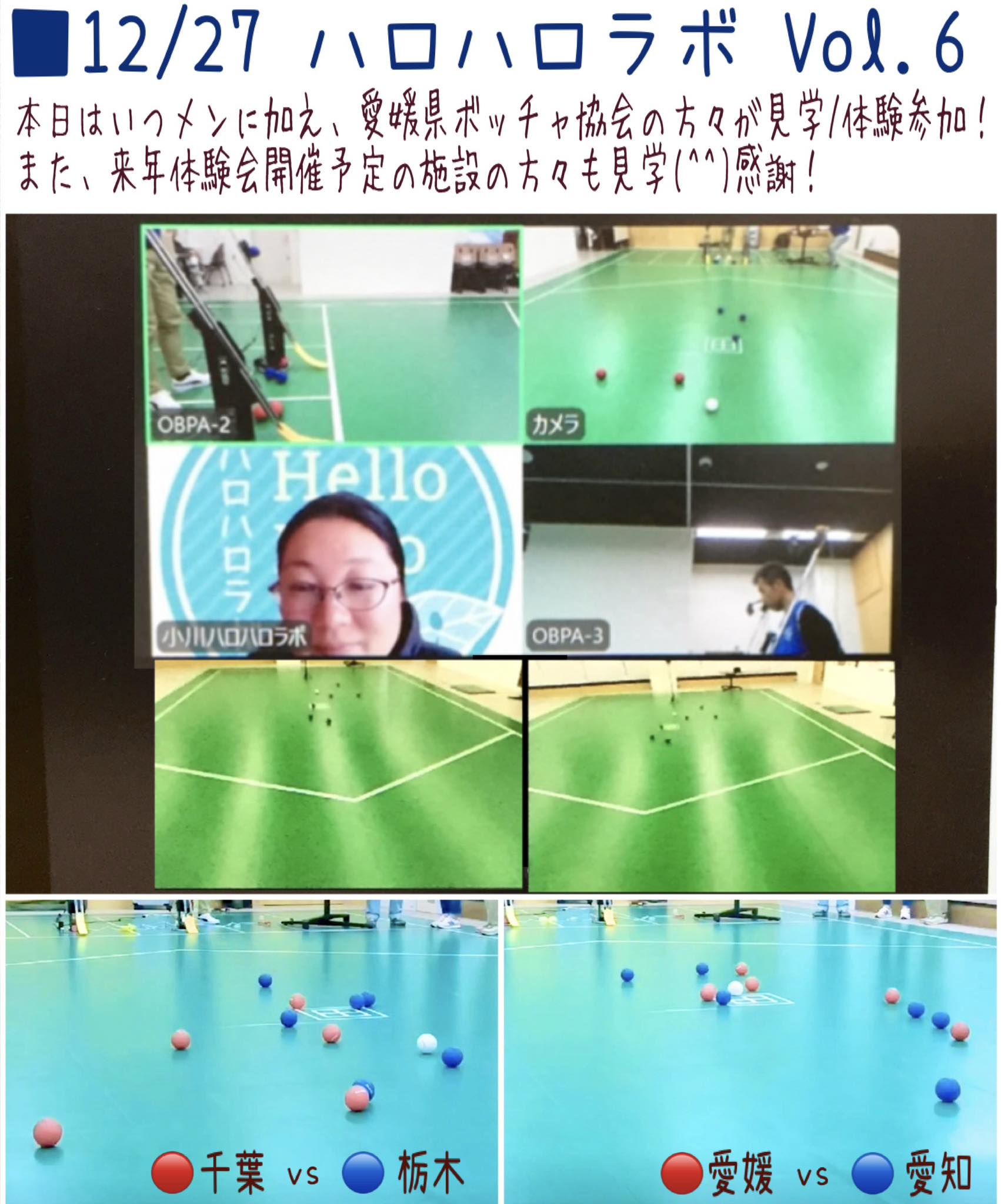■1/11 ハロハロラボでオンラインボッチャ体験会 ハロハロラボ様との共同企画で国内各地をオンラインで結んだ、オンラインボッチャ体験会でした! ・コート:東京都中央区 CAC holding ・ハロハロラボ:栃木県真岡市 ・参加者:千葉県、栃木県、愛知県 ![]() |